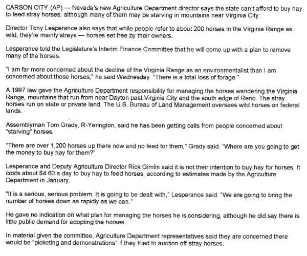 Nonetheless Lesperance temporarily duped state legislators into believing that there was an actual crisis out on the Virginia Range. These and related false claims started what the Nevada Appeal dubbed as the "Horse Wars."